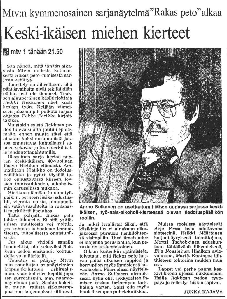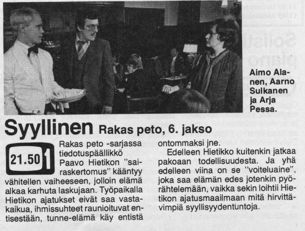 1. Valheet (4.4.1979) Sarja kertoo 40-vuotiaan teollisuuden tiedotuspäällikön elämän ajautumisesta umpisolmuun. Pelko nostaa päätään, mutta Hietikko tietää, että siihen auttaa ryyppy.